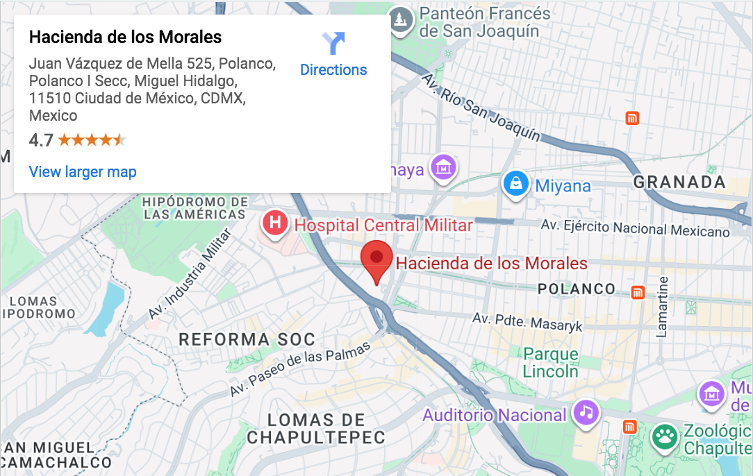 El hotel está a menos de 15 minutos de Hacienda de los Morales y tiene una ubicación muy conveniente para explorar todo lo que Polanco tiene para ofrecer. También estará a poca distancia caminando del restaurante de la tornaboda (detalles por venir).